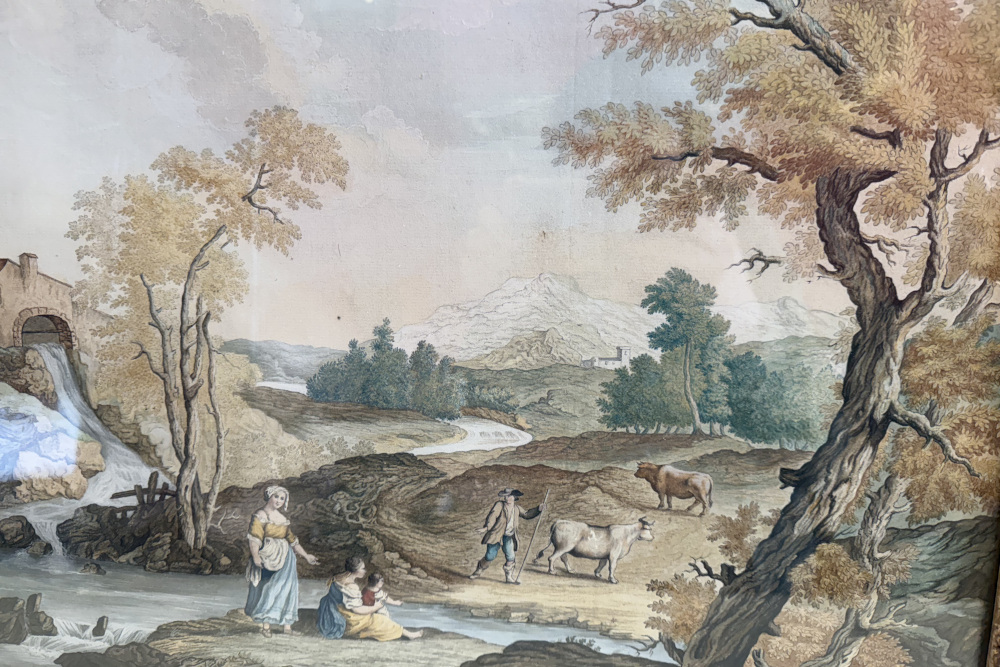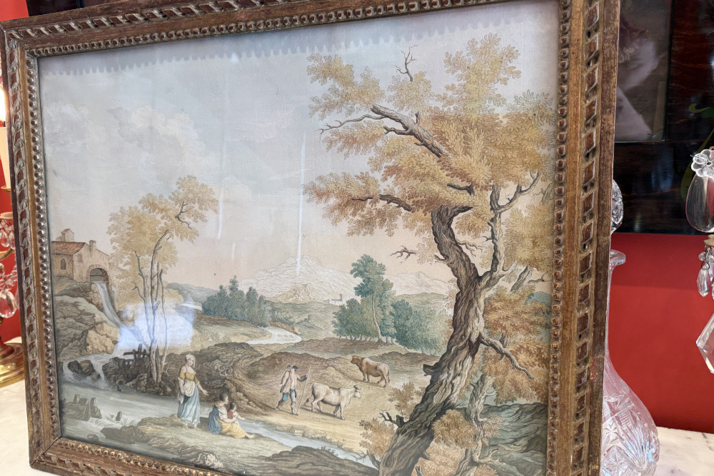 Tableau huile sur toile représentant un paysage (italien ?) avec personnages, dans le style école française XVIIe siècle.