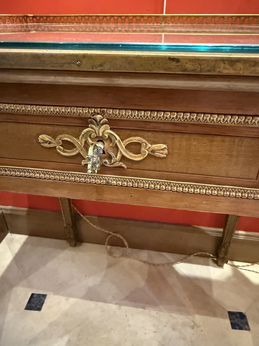 Rare console à système d’époque Charles X en érable moucheté, fond de glace et plateau de marbre blanc.
